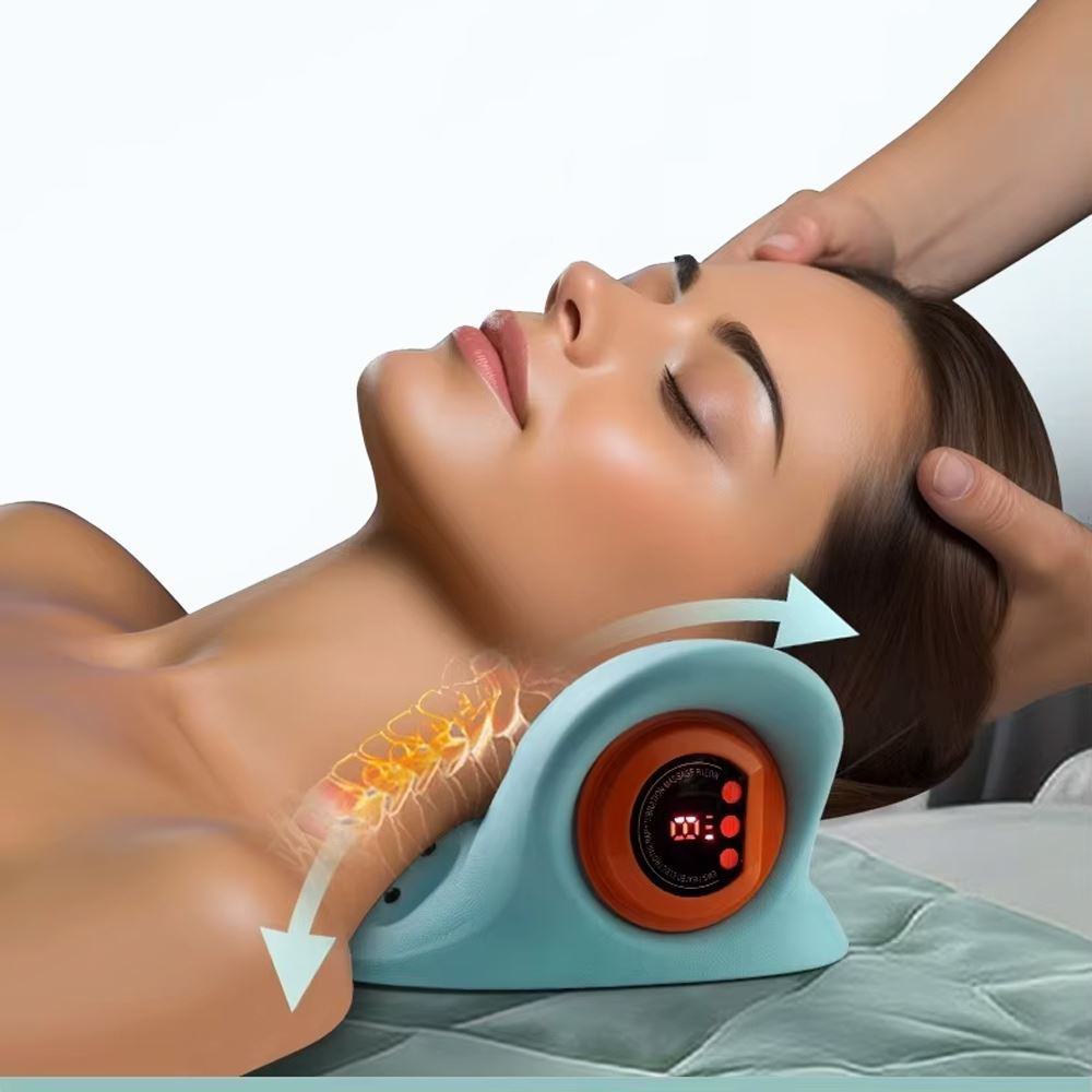 It’s a device designed to gently stretch and relax the neck muscles while improving posture and relieving tension. It combines traction (gentle pulling to decompress the spine) with massage and sometimes heat or vibration for deeper relaxation.