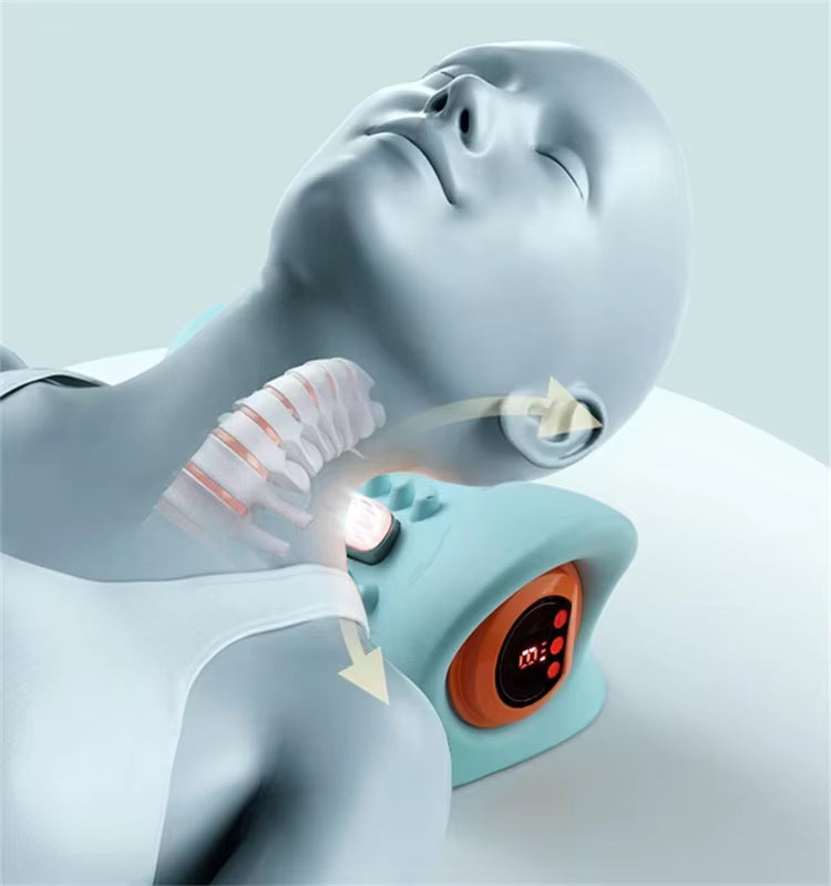 The device supports your neck and applies controlled traction to relieve pressure on your cervical spine. Many models also use kneading or vibration to stimulate blood flow and relax stiff muscles.
